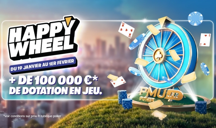 15 janvier 2026 — PMU lance une nouvelle Happy Wheel du 19 janvier au 1er février. Cette fois-ci, PMU Poker double la mise par rapport à l’édition précédente avec une dotation impressionnante de plus de 100.000 eu...