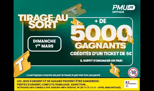 26 février 2026 — En mars, PMU.fr vous propose une série de promotions particulièrement avantageuses… Tirages au sort Le dimanche 1ᵉʳ mars, 350 parieurs ayant effectué au moins un pari hippique virtuel...